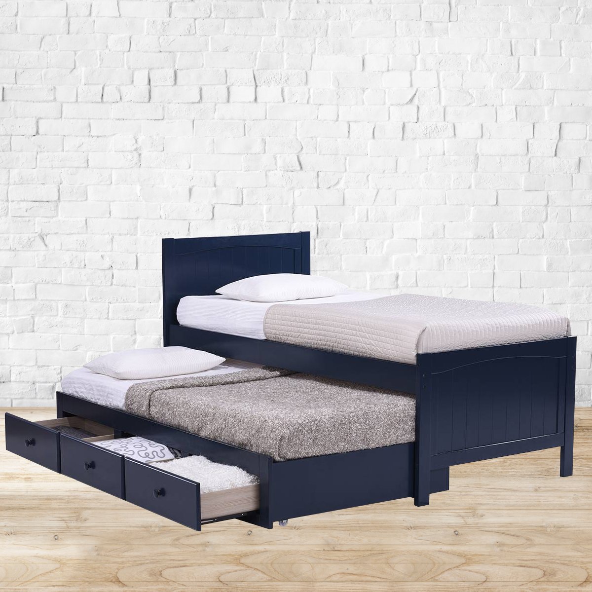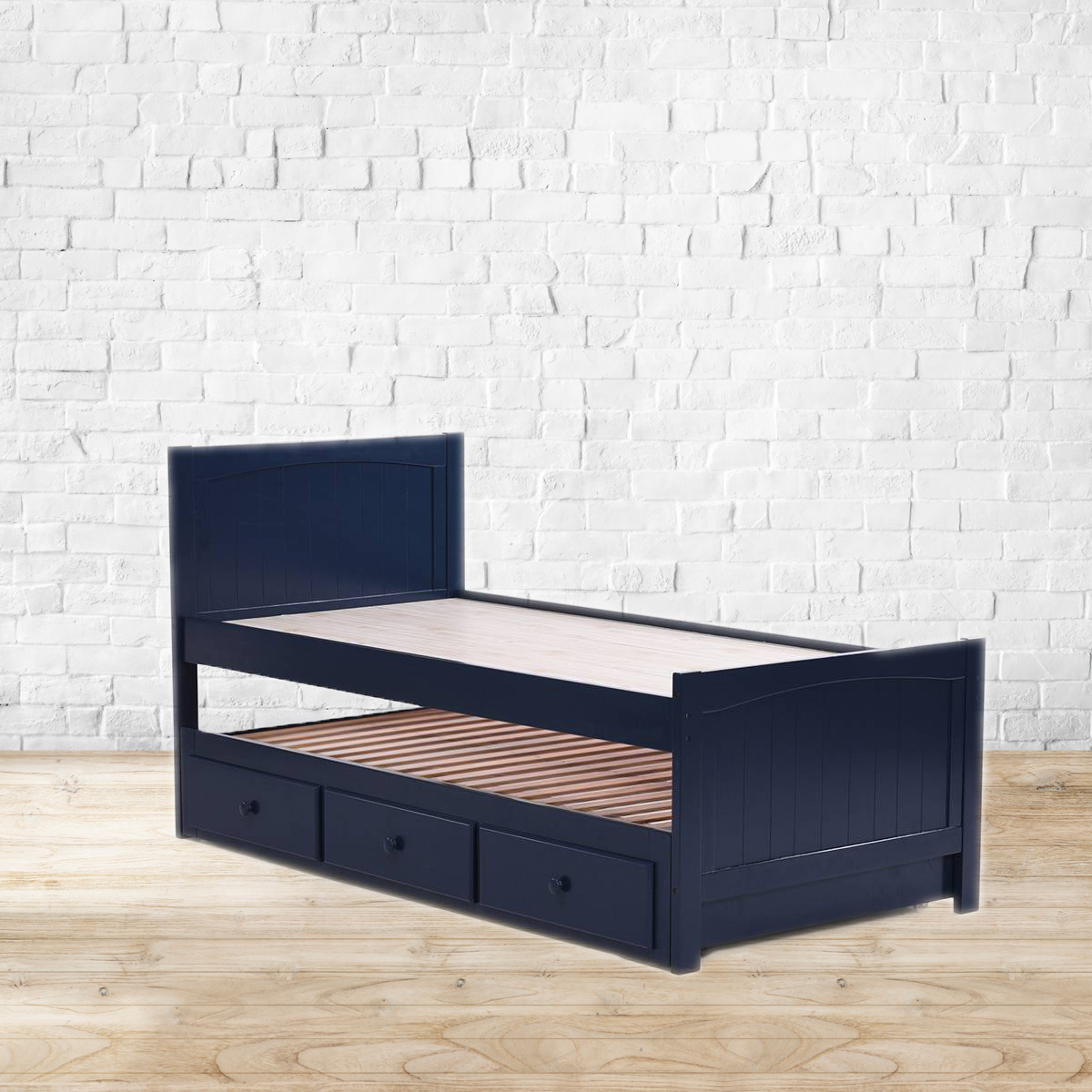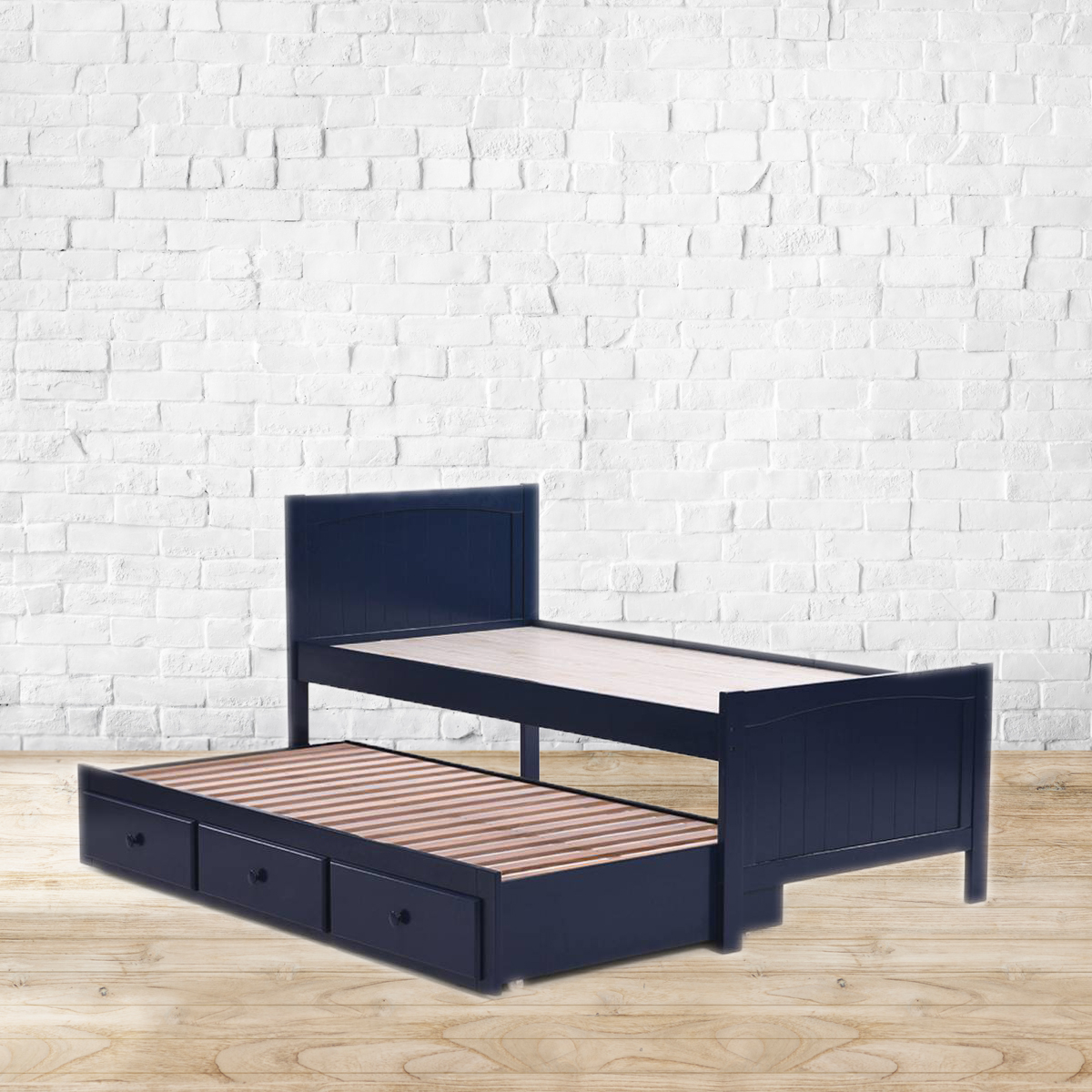 Very bery roomy. Despite its compact size, this Bering single bed is surprisingly spacious. Packed below the raised frame of the bed is a trundle bed, easy to pull out and perfect for when you have guests over. Also featuring three roomy drawers to hold linen, blankets and more, the Bering single bed is multi-purpose at its very best.Made from Rubberwood, Veneer and MDF.Mattress board, and drawer base and sides made from MDF.Recommended mattress size: Bed - 36” x 75” | Trundle - 36" x 72" x 4".Please refer to images for dimension details. For indoor use only. Note: There are no channels attaching the trundle to the bed. Therefore, you can configure it to open out to the left or the right, as required. Note: Mattress and other accessories not included, unless specified otherwise