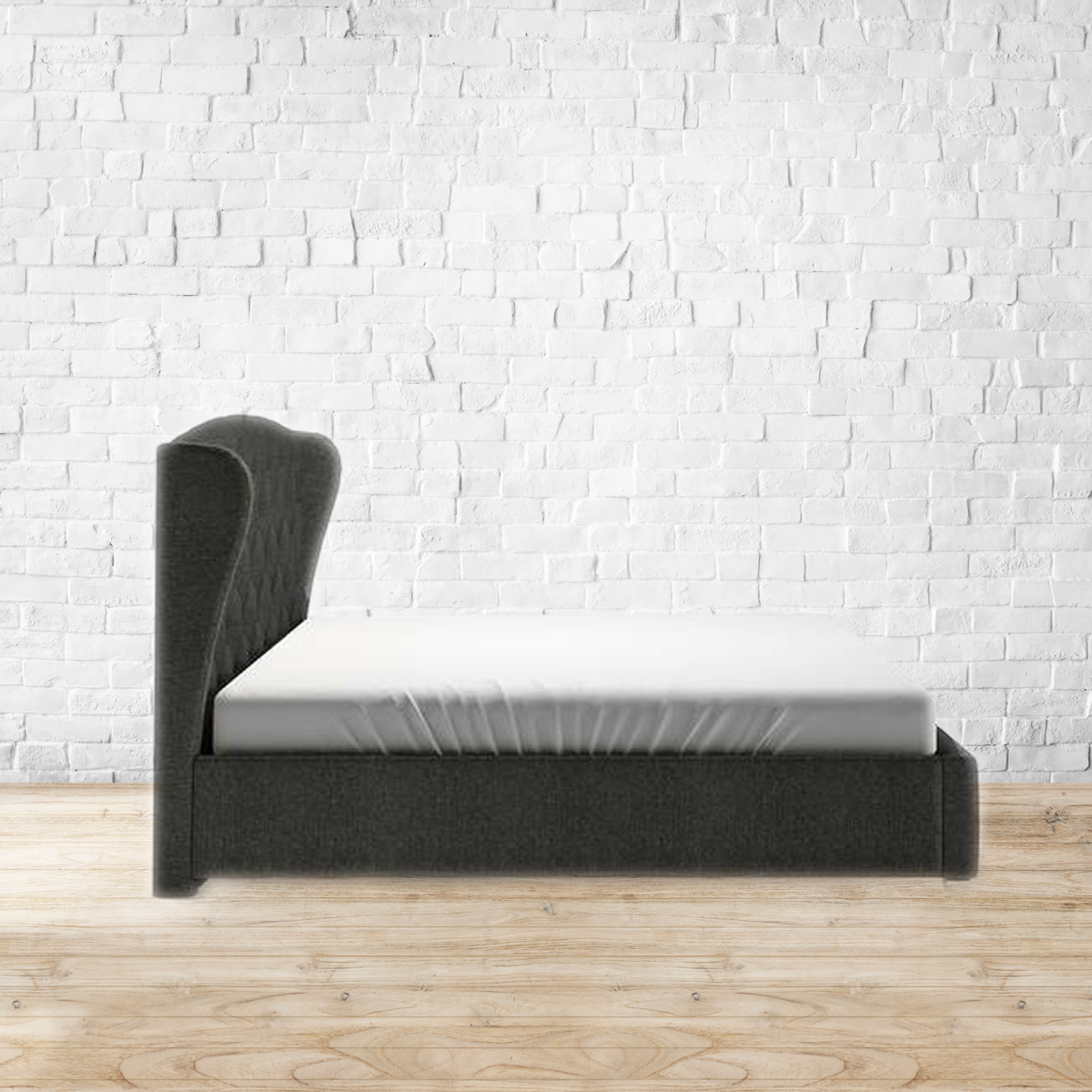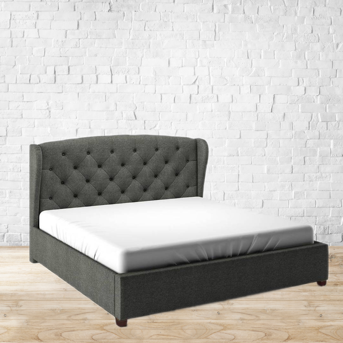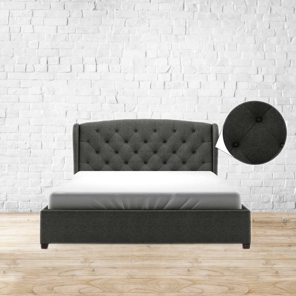 Sleep retreat. Transform your bedroom into a sleep haven with the gorgeous Holmebrook upholstered bed. The seamless fabric upholstery works its magic to soften your space and make it more inviting. Plushly padded, the tall headboard is all the more striking courtesy button tufted detailing and wings. Place it flush against the wall or float it in the middle of the room, this bed is designed for attention. Recommended mattress size for king is 78 x 72 inches; queen is 78 x 60 inches.Can accommodate mattresses between 6 and 10 inches. Bed frame made of high quality MDF and particle board.Rubberwood legs.Fabric upholstery; cushioning of PU foam and polyfill.MDF board to support the mattress. Please refer to the images for dimension details. For indoor use only. Note: Mattress and other accessories not included, unless specified otherwise.