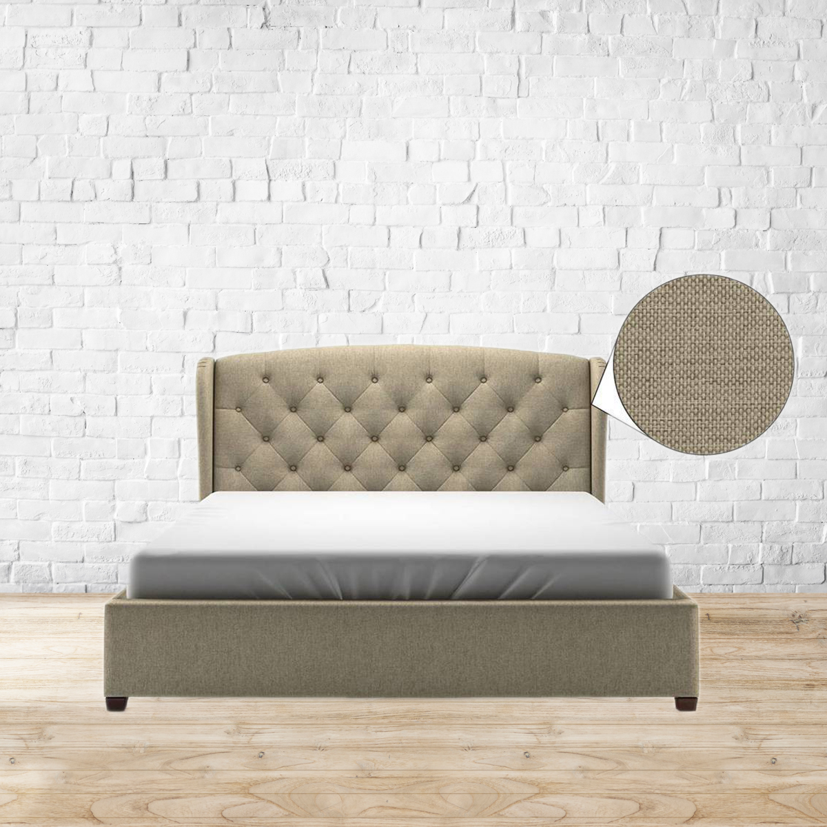 Sleep retreat. Transform your bedroom into a sleep haven with the gorgeous Holmebrook upholstered bed. The seamless fabric upholstery works its magic to soften your space and make it more inviting. Plushly padded, the tall headboard is all the more striking courtesy button tufted detailing and wings. Place it flush against the wall or float it in the middle of the room, this bed is designed for attention. Recommended mattress size for king is 78 x 72 inches; queen is 78 x 60 inches. Can accommodate mattresses between 6 and 10 inches. Bed frame made of high quality MDF and particle board. Rubberwood legs. Fabric upholstery; cushioning of PU foam and polyfill. MDF board to support the mattress. Please refer to the images for dimension details. For indoor use only.