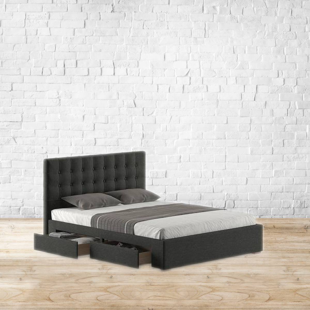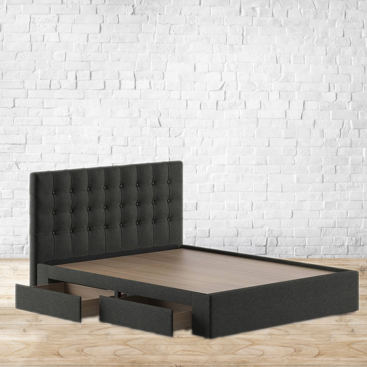 Hit snooze (again). The Linacre storage bed will tempt you to sleep in. Upholstered in a rich, premium fabric, the Linacre is all elegance, and makes for the perfect roommate. Seamlessly finished, it adds tone and texture to your space, and function as well. Storage drawers on either side offer room to stow away extra blankets, old magazines, and what have you. The plushly padded headboard is designed for leaning against, while you work, or catch up on TV. Hard to resist, isn’t it? Recommended mattress size for king is 78 x 72 inches; queen is 78 x 60 inches. Can accommodate mattresses between 6 and 8 inches. Bed frame made of high quality MDF and particle board. Rubberwood legs. Polyester upholstery; cushioning of PU foam and polyfill. MDF board to support the mattress. Refer to the images for dimension details. For indoor use only.