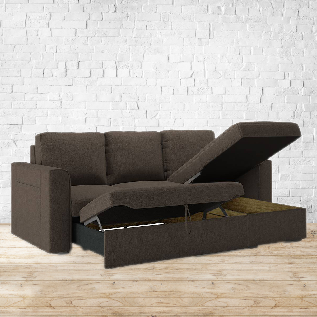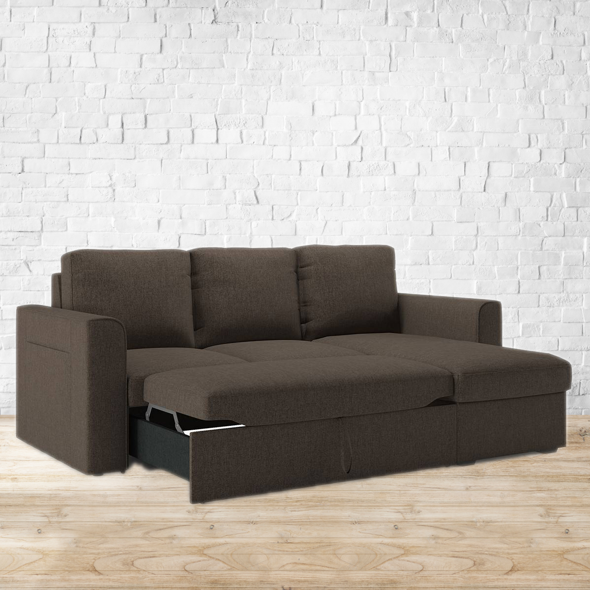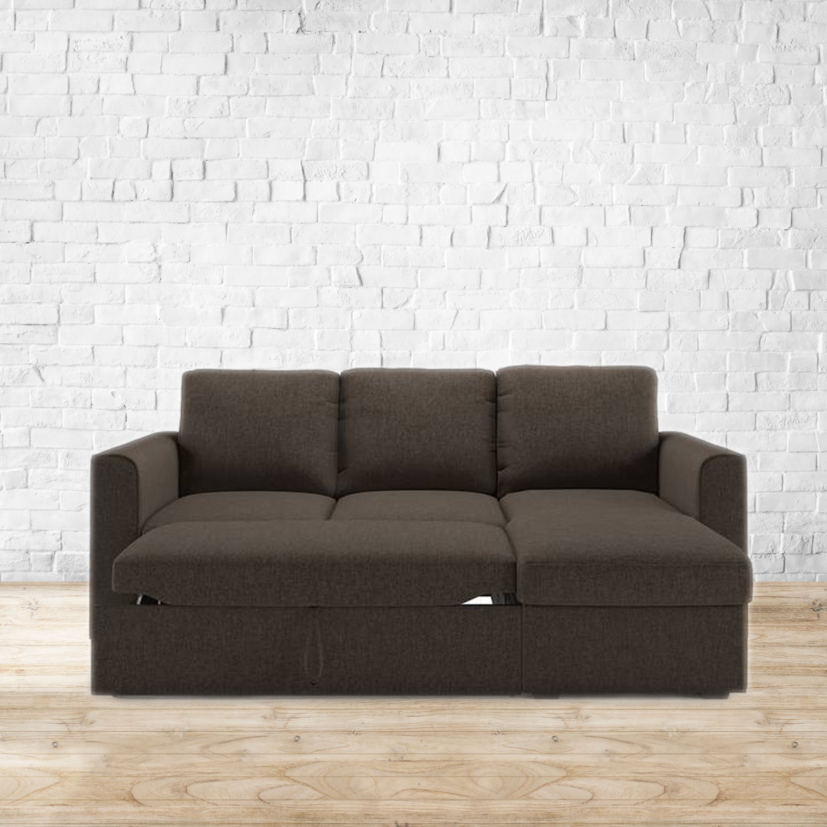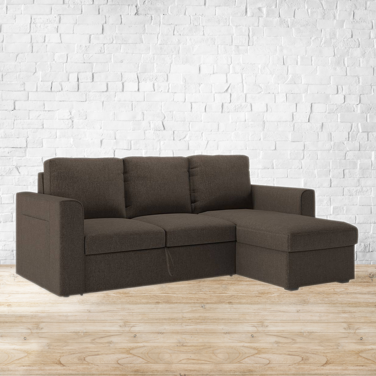 Sensational Sectional. The Kowloon helps you make the most of your space by hiding a guest room in the middle of your living room or den. By day, it's a comfortable sectional sofa that seats four. But simply roll out the drawer and pull the extra bed section out and up, to transform it into a spacious double bed in seconds. Lift the chaise to tuck away pillows, blankets, and more in the spacious storage area below. Refer to the images for details of dimensions. For indoor use only