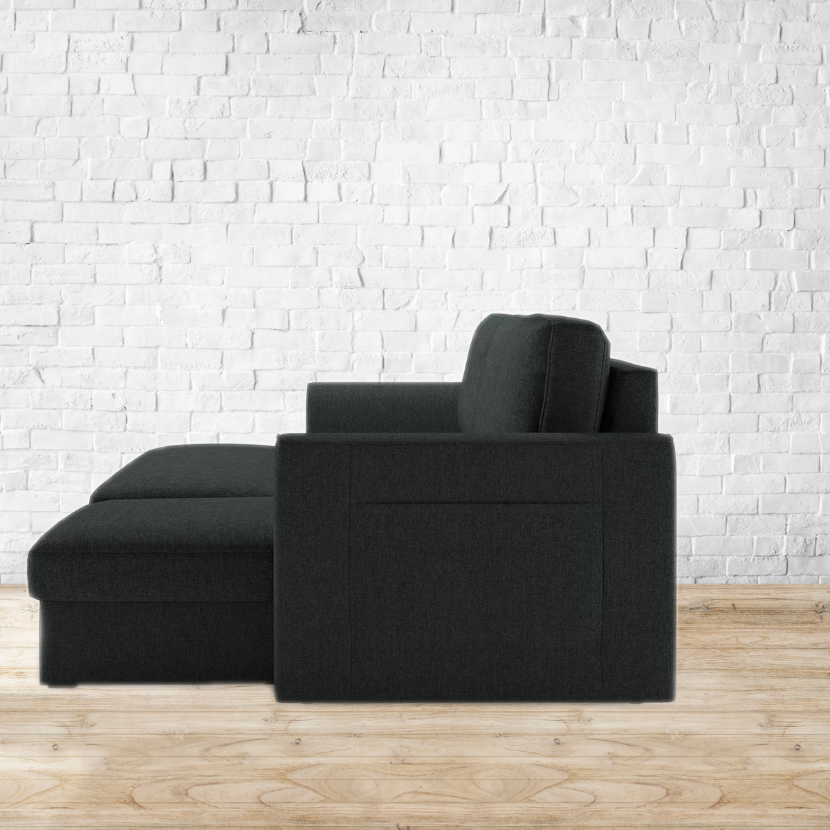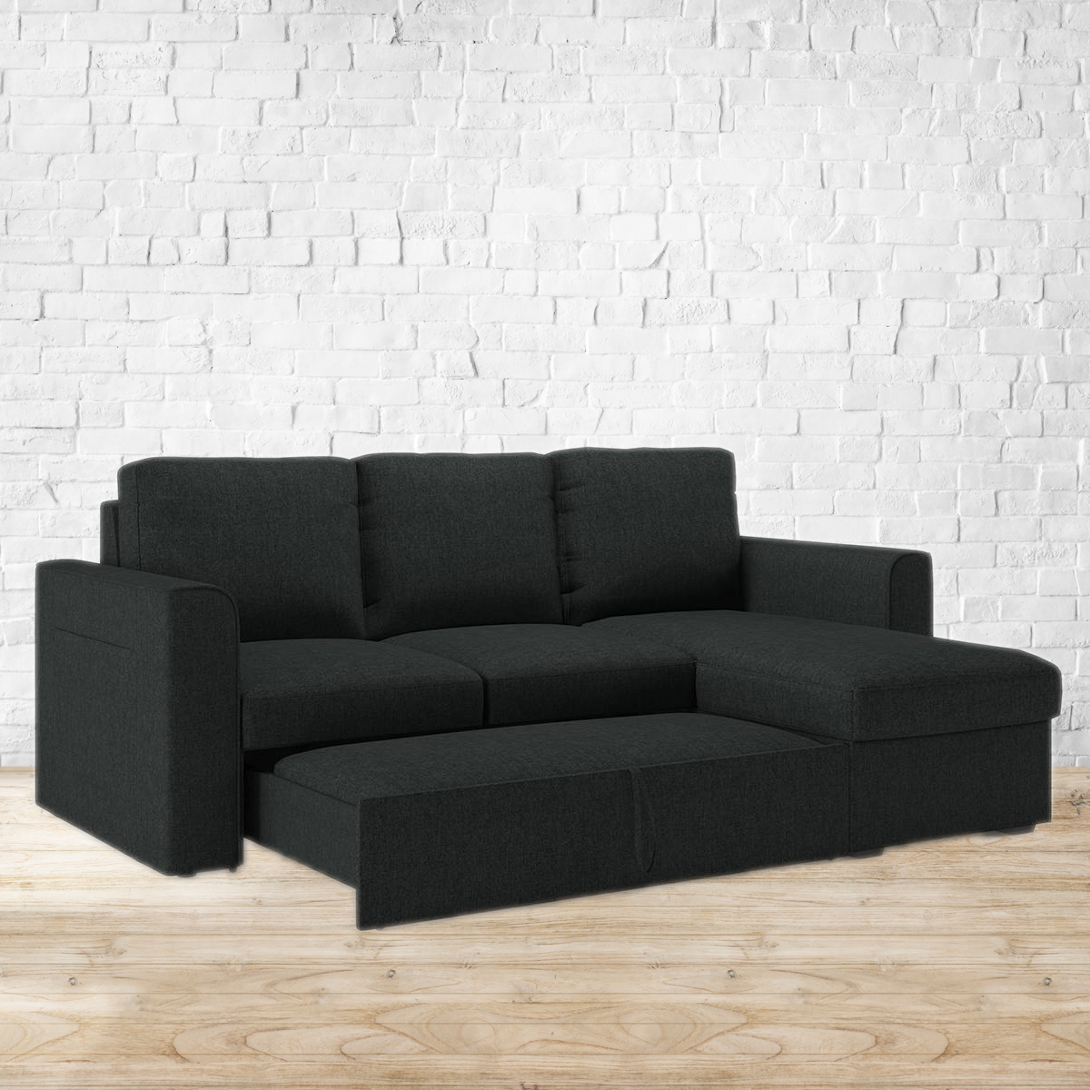 Sensational Sectional. The Kowloon helps you make the most of your space by hiding a guest room in the middle of your living room or den. By day, it's a comfortable sectional sofa that seats four. But simply roll out the drawer and pull the extra bed section out and up, to transform it into a spacious double bed in seconds. Lift the chaise to tuck away pillows, blankets, and more in the spacious storage area below. Refer to the images for details of dimensions. For indoor use only