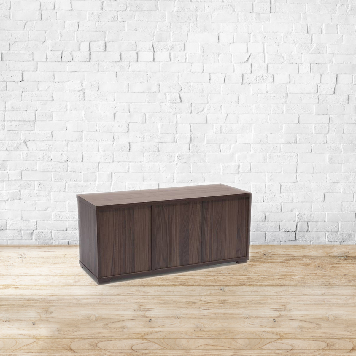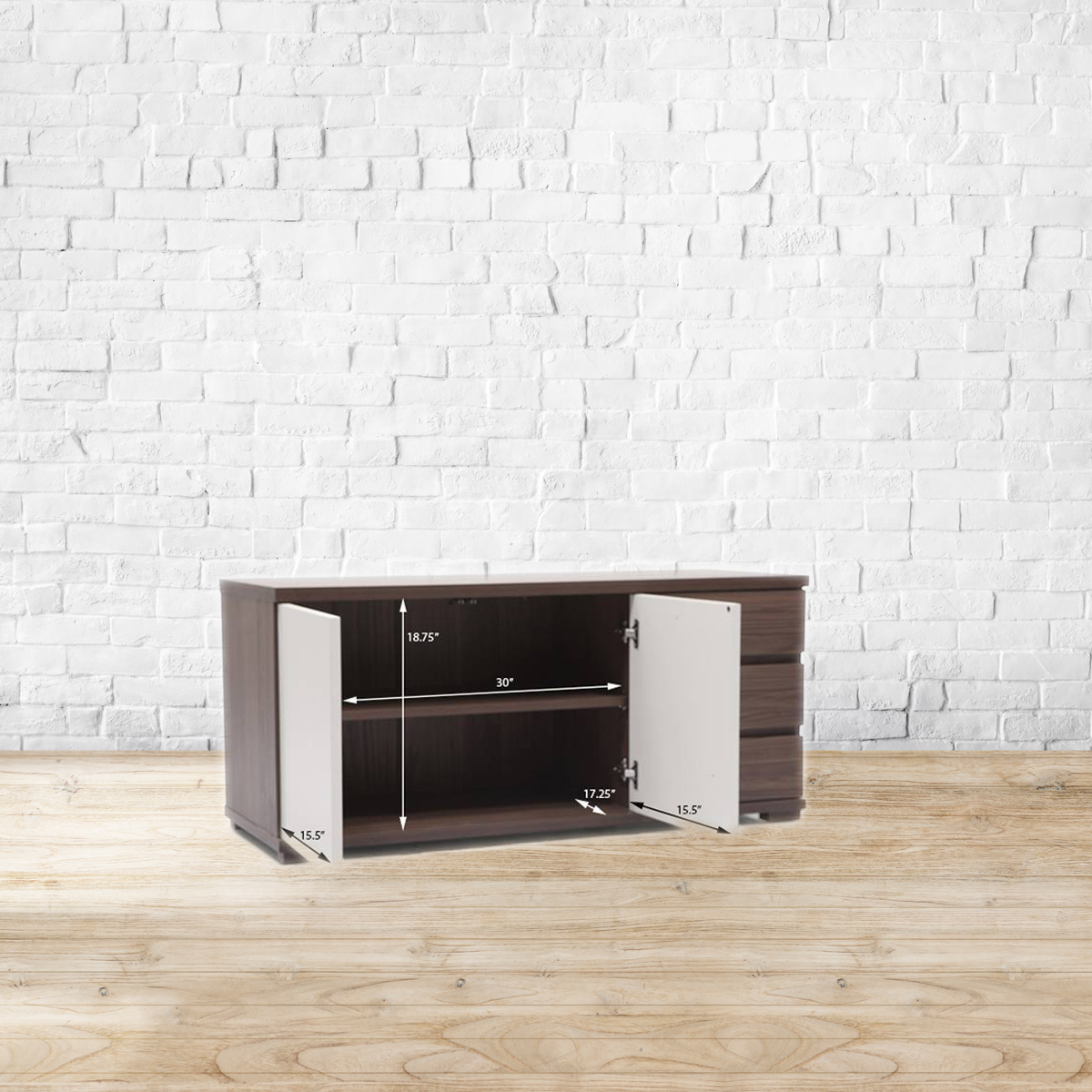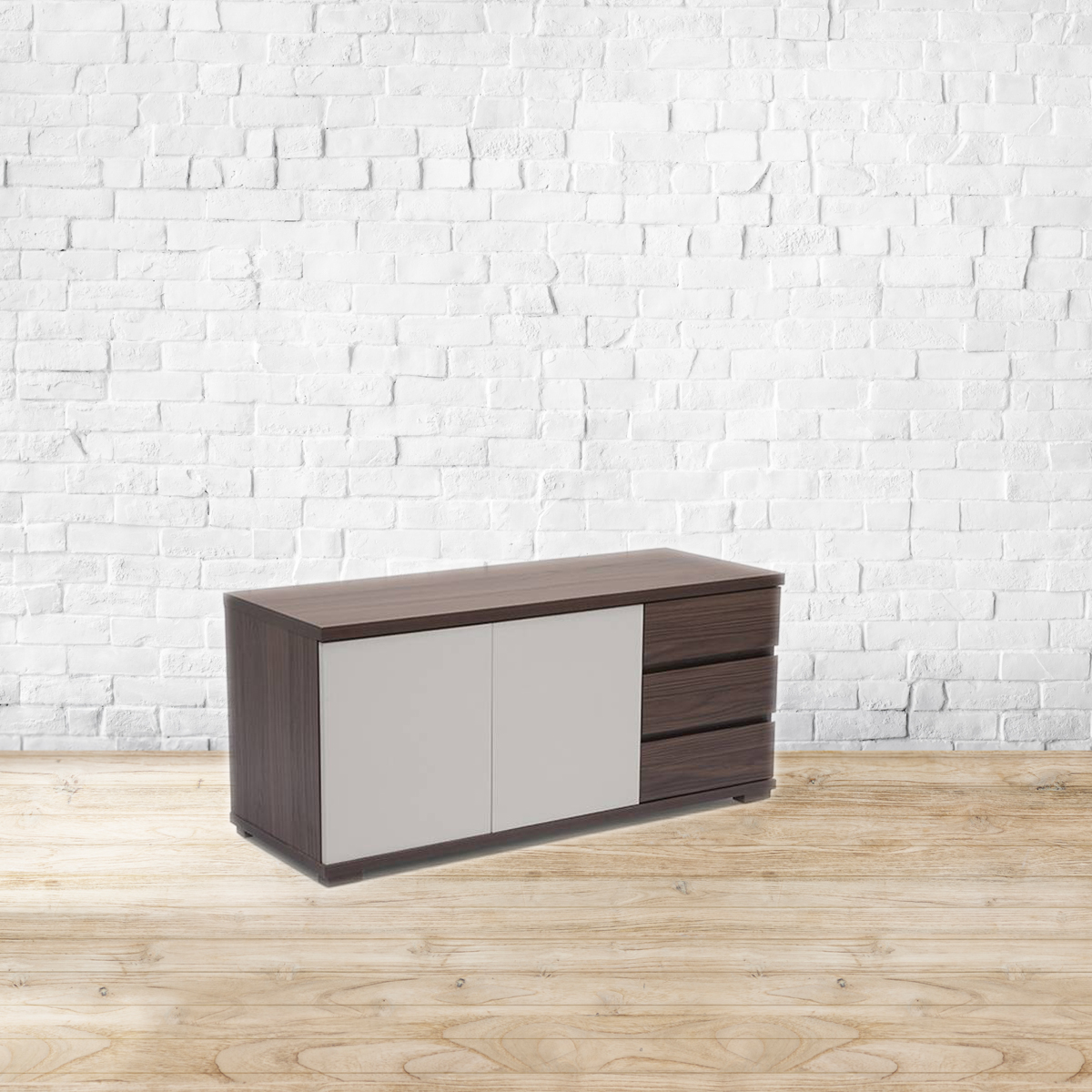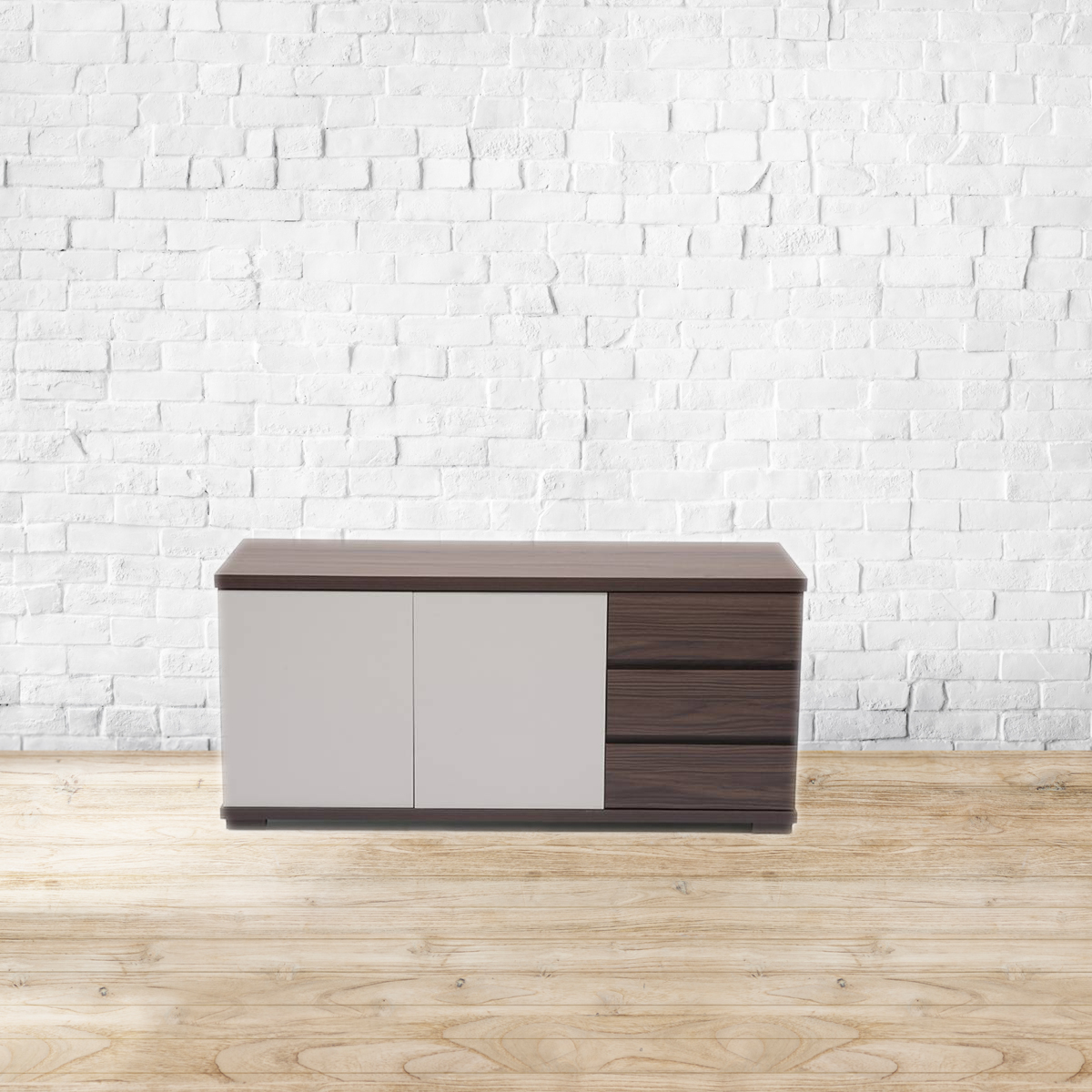 Blissfully Bavarian. The Bayern family's crisp, clean lines and functional details create a contemporary evolution of German modernism. The low sideboard comes with 2 cabinets and 3 drawers. Use it to hold your all your dining essentials, crockery, cutlery, place settings and more. The cabinet shutters feature convenient 'press to open' hardware, while the shelf inside is removable for extra versatility. The rear of the sideboard is also finished with wood grain laminates, so that the piece can be used away from the wall, as a room divider. Made of high quality MDF and particle board, with wood finish and off-white laminate surfaces. Refer to the images for dimension details. Indoor use only.