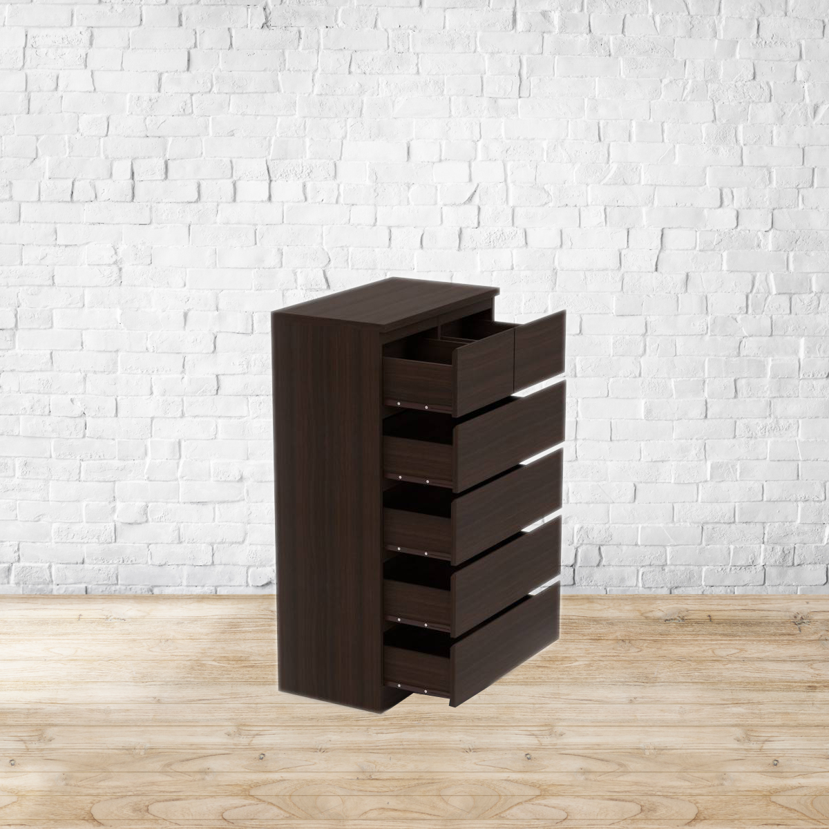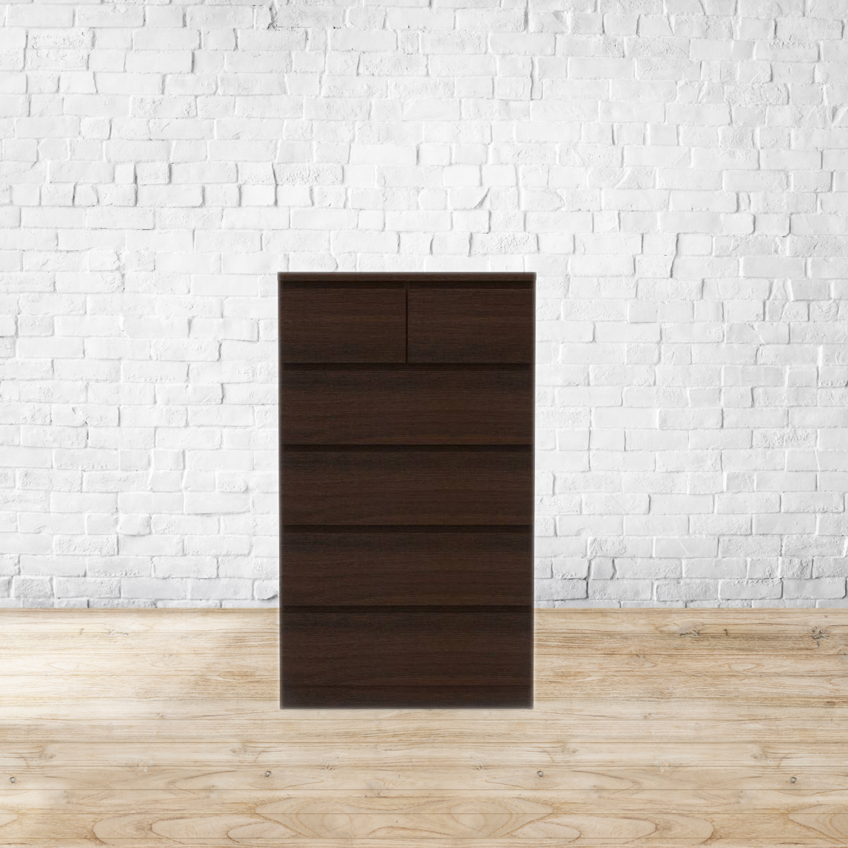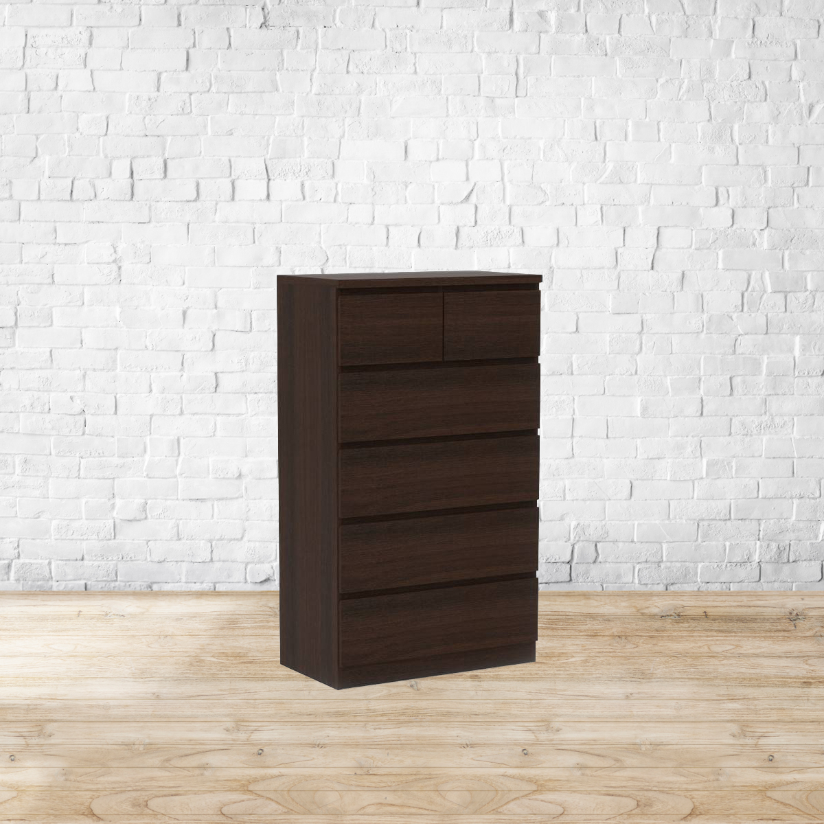 A fine line. All neat lines and angles, the Bocado chest of drawers is the perfect blend of form and function. Use it in your bedroom for some extra storage - it’s a great way to keep your wardrobes neat and uncluttered. You can also use it as a TV unit in the living room and store your DVDs and media devices in its roomy drawers. Beautiful and elegant, it’ll fit right in, no matter where you choose to place it. Made from MDF and particle board, with a dark walnut finish. Please refer to images for dimension details. For indoor use only.