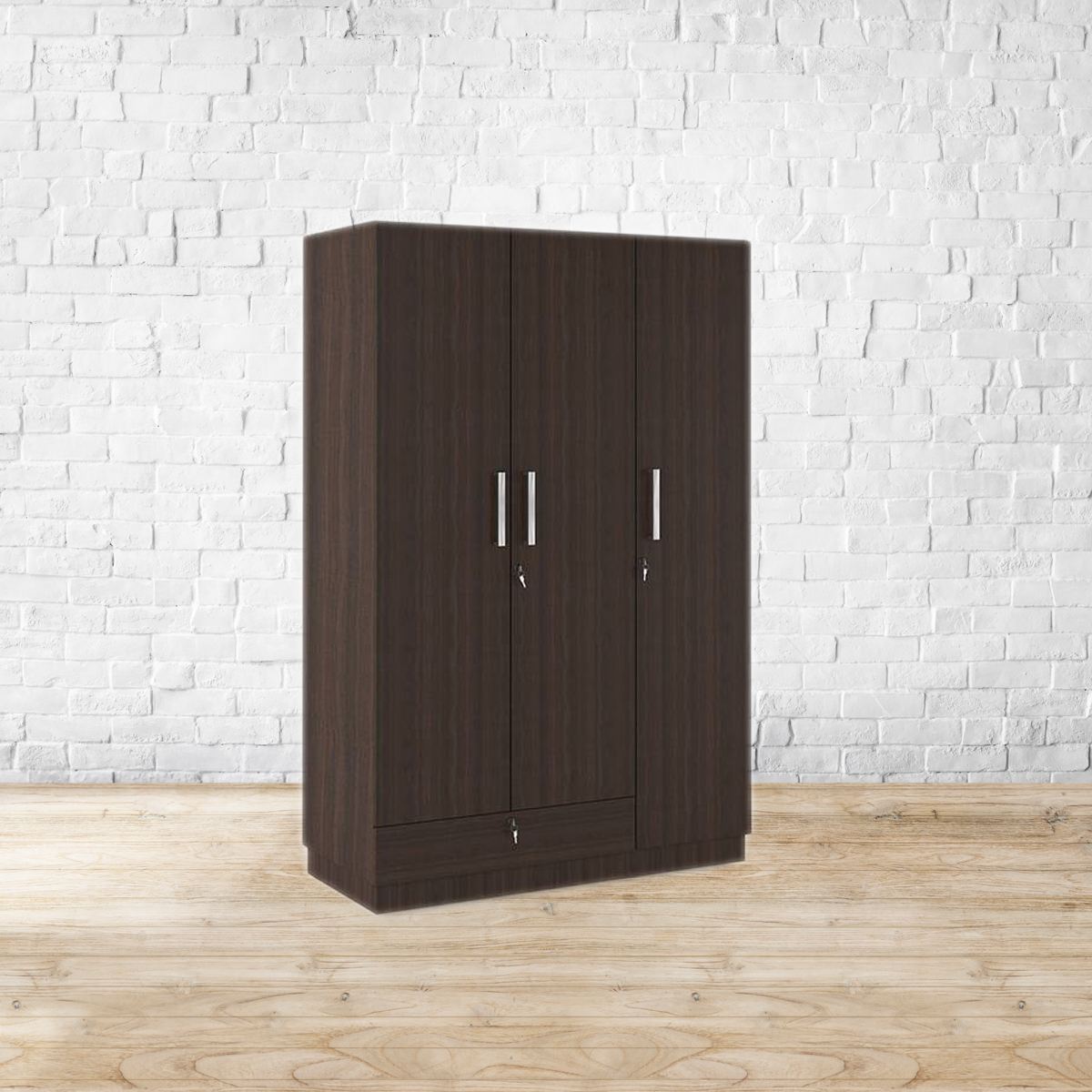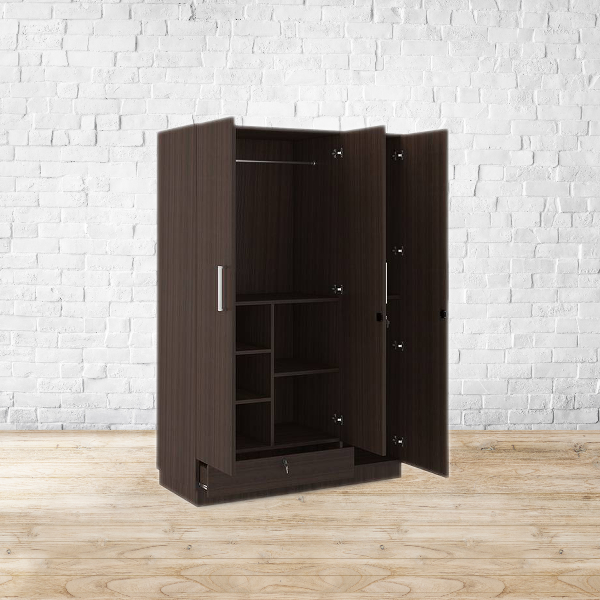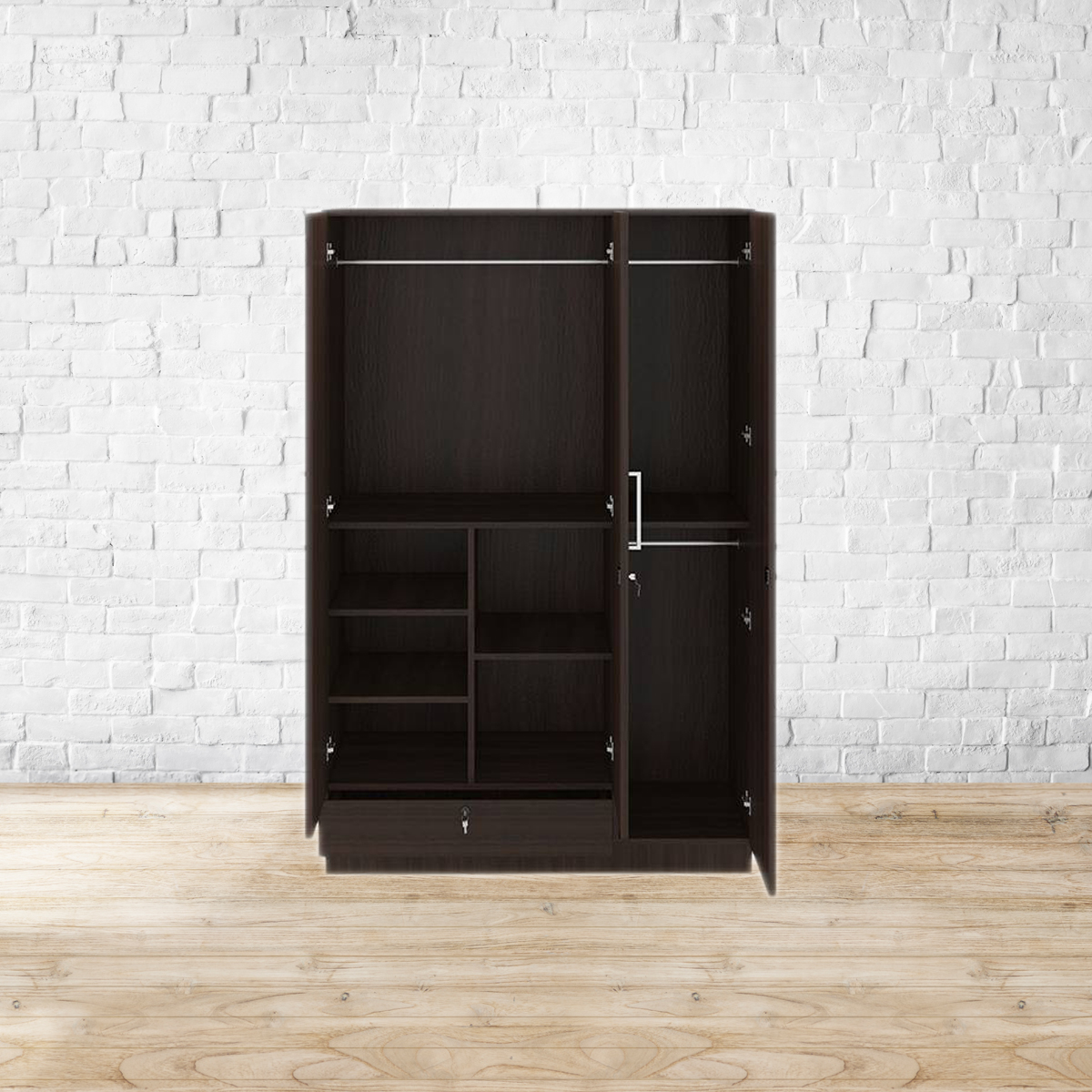 A fine line. All neat lines and angles, the Bocado wardrobe is the perfect blend of form and function. With utilitarian shelves of varying sizes, it makes for a great way to keep your bedroom uncluttered. A closed shelf with a lock ensures your keepsakes stay safe. The subdued dark walnut finish means it’ll fit right in with every bedroom. Made from MDF and particle board, with a dark walnut finish. Please refer to images for dimension details. For indoor use only.