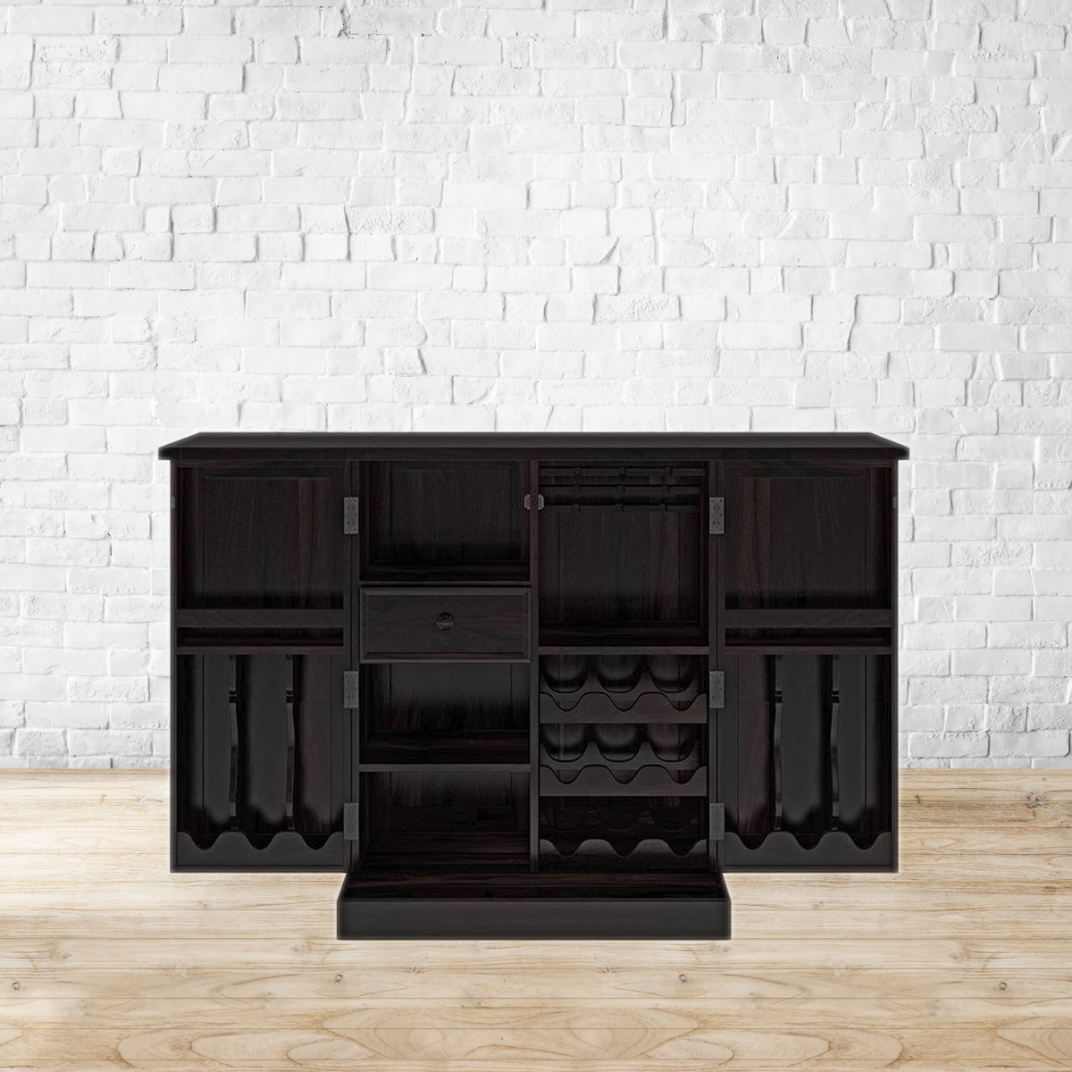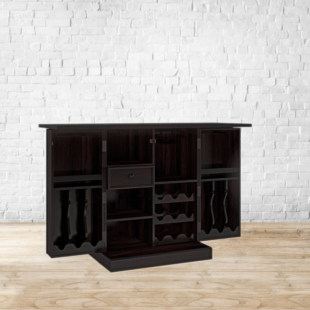 A large spacious bar cabinet with unfolding surfaces and cabinets. Dedicated storage racks. can accommodate 21 full size bottles, and 9 long stemmed glasses Open shelves can be used for other types of glasses and smaller bottles. The built in drawer provides room for bar accessories. Made of high grade Sheesham wood. Refer to the images for details of dimensions. No assembly required. Indoor use only.