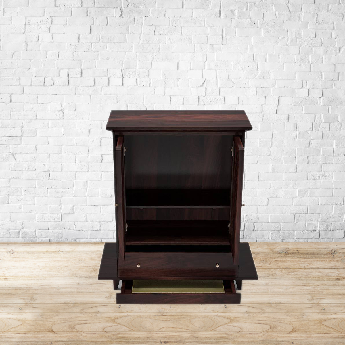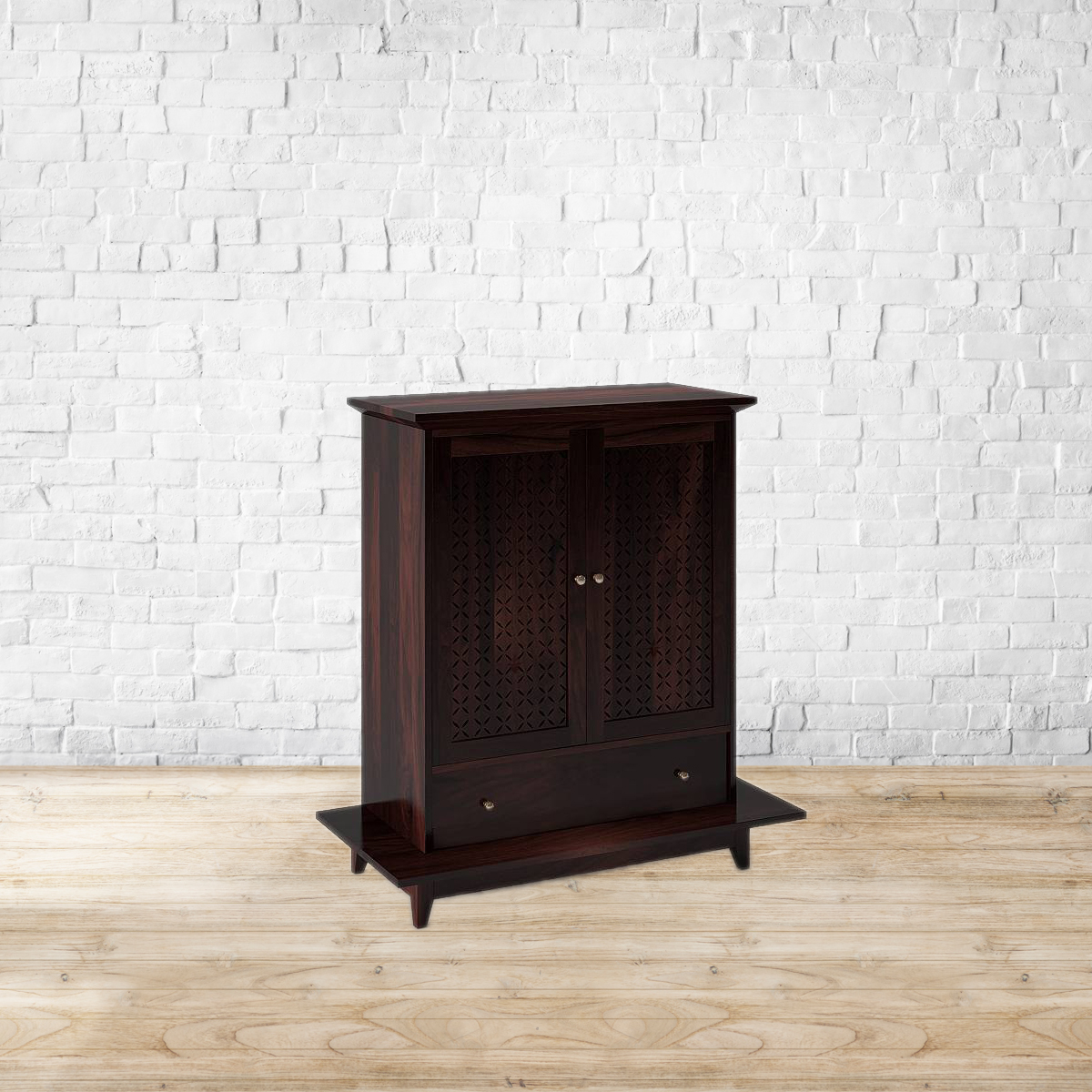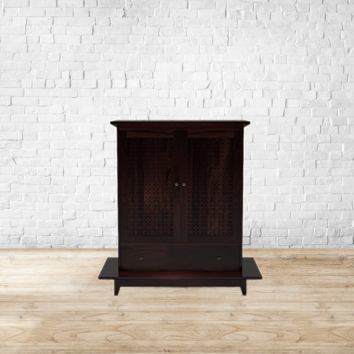 Say a little prayer for you. Elegant lattice doors and thoughtful features prove that God is indeed in the details. Spacious interiors and an adjustable shelf make plenty of room for essentials. There’s also a variant with two drawers and a removable metal plate for easy cleaning. Made of high grade sheesham wood.Back panel and drawer base made of MDF. Removable metal plate included in the variant with drawers only. Please refer to images for dimension details. For indoor use only