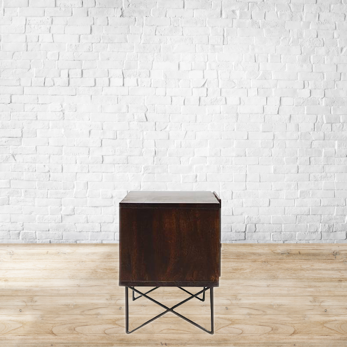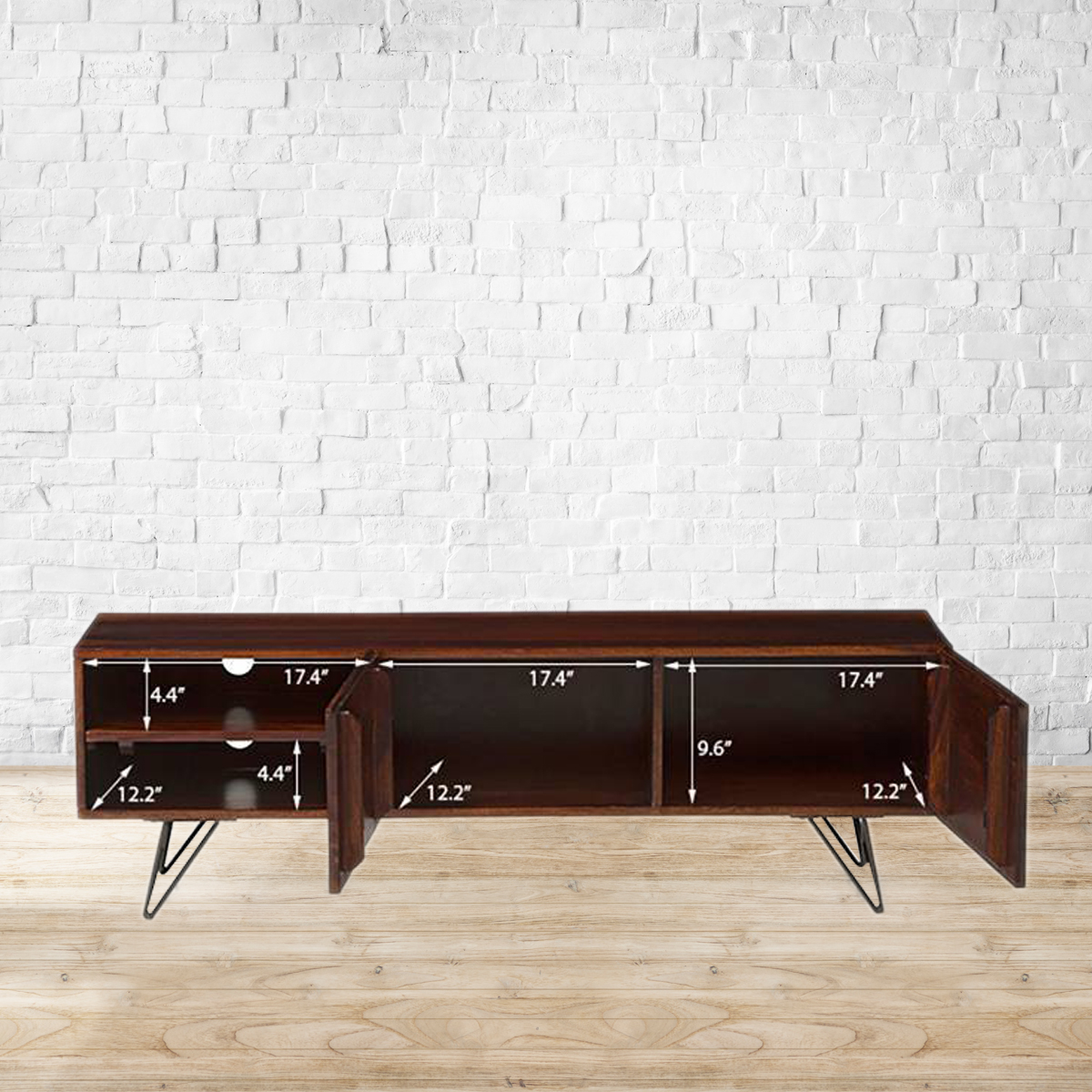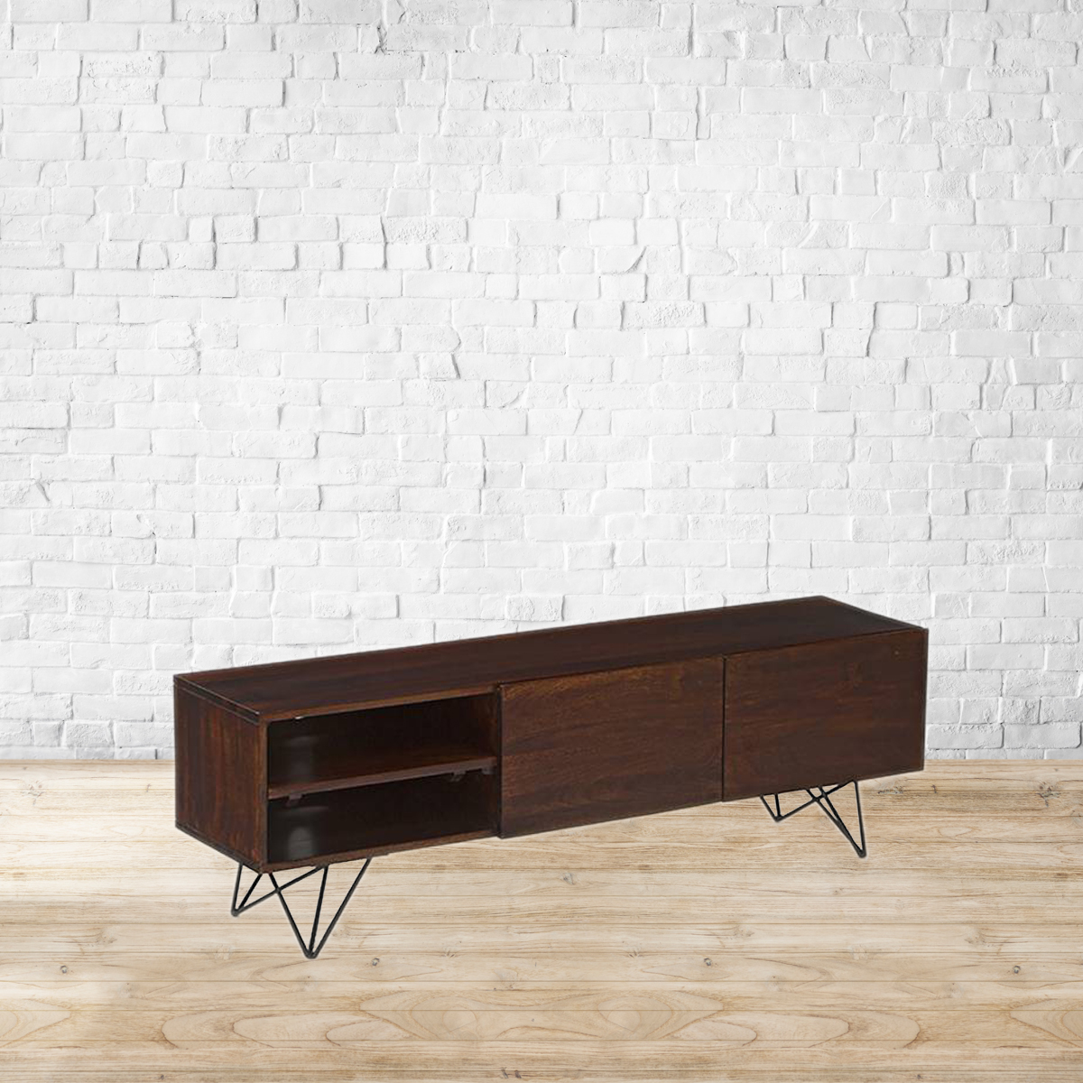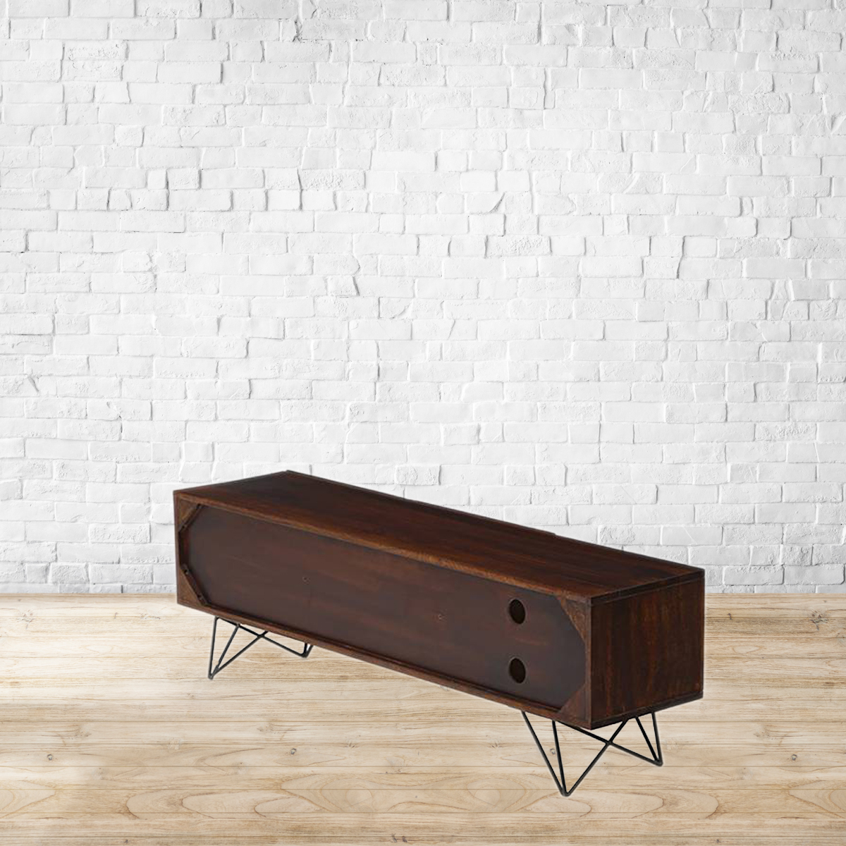 Edgy meets elegant. Crafted from high-grade Mango wood, the Dyson TV unit is a show stealer. Gorgeous textured wood and hairpin legs makes this the perfect contemporary addition to your space. Designed to be used without any knobs or handles, this hardware-free tv unit has plenty of room for all your media. The removable shelf makes it easy to accommodate electronics on different sizes. The cutouts keep wires and cables in check. Pair with designs from the Dyson range for a fully co-ordinated space, that’s all industrial chic. Made from solid Mango wood. Back panel made from MDF. Powder coated metal legs. Removable shelf. Please refer to images for dimension details.Indoor use only. Note : We will not be able to mount the TV to the wall-mounted TV unit or handle rewiring. Please arrange for a handyman/electrician to get these done.