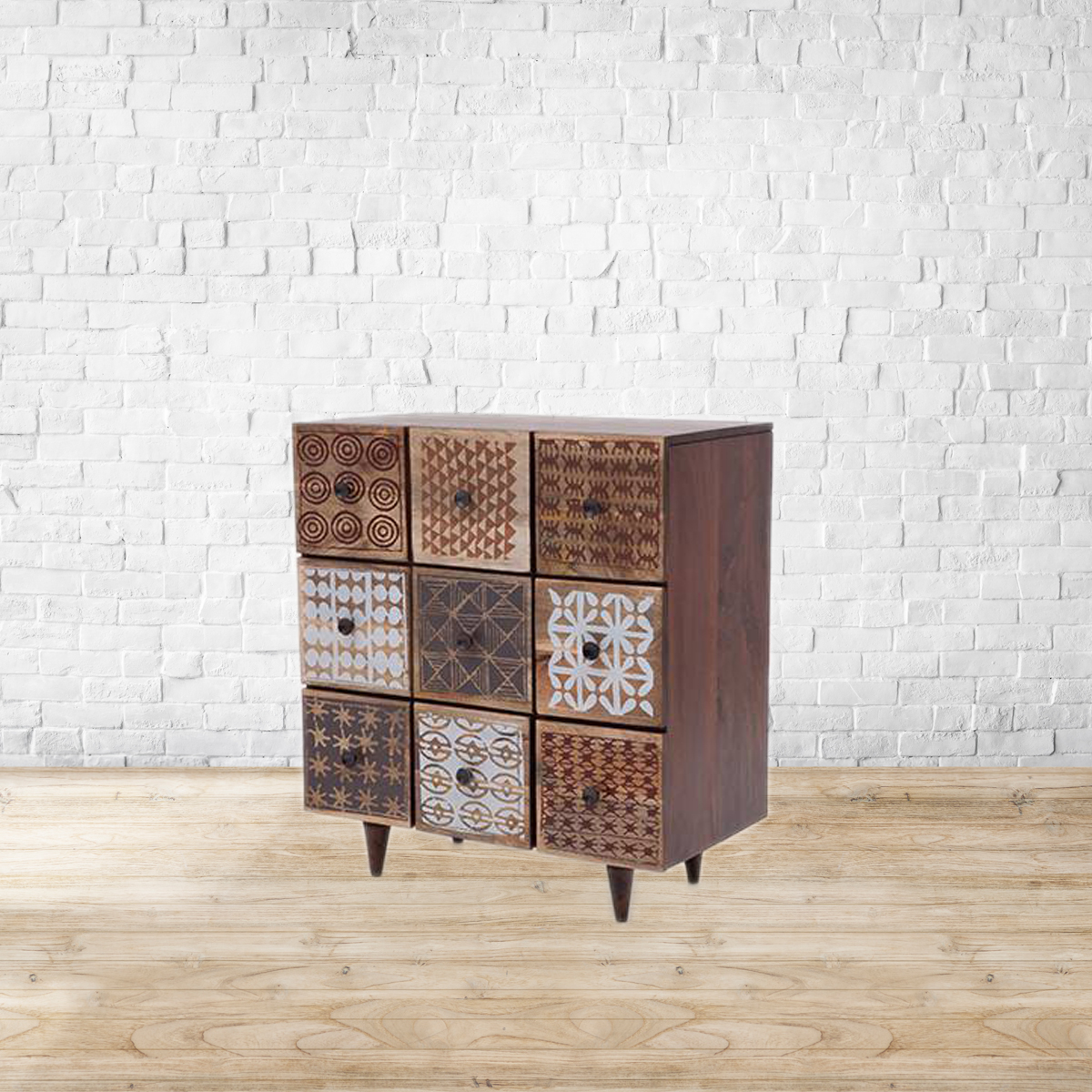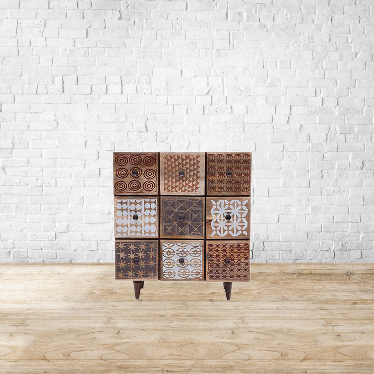 The Emaada Sideboard mixes mid century modern forms with ethnic tribal patterns to create a beautifully eclectic style. With its ample storage space, this 5 Drawer, 4 Door Sideboard perfectly fits into your living Room.. Made of high grade Mango wood. Screen printed drawers. Refer to images for dimensions. Indoor use only