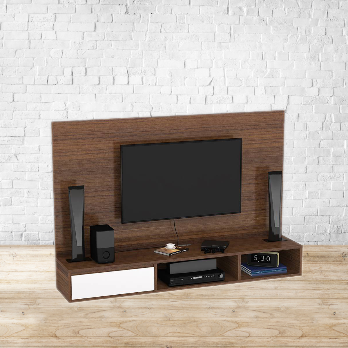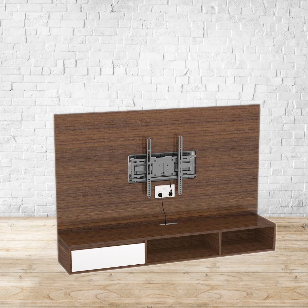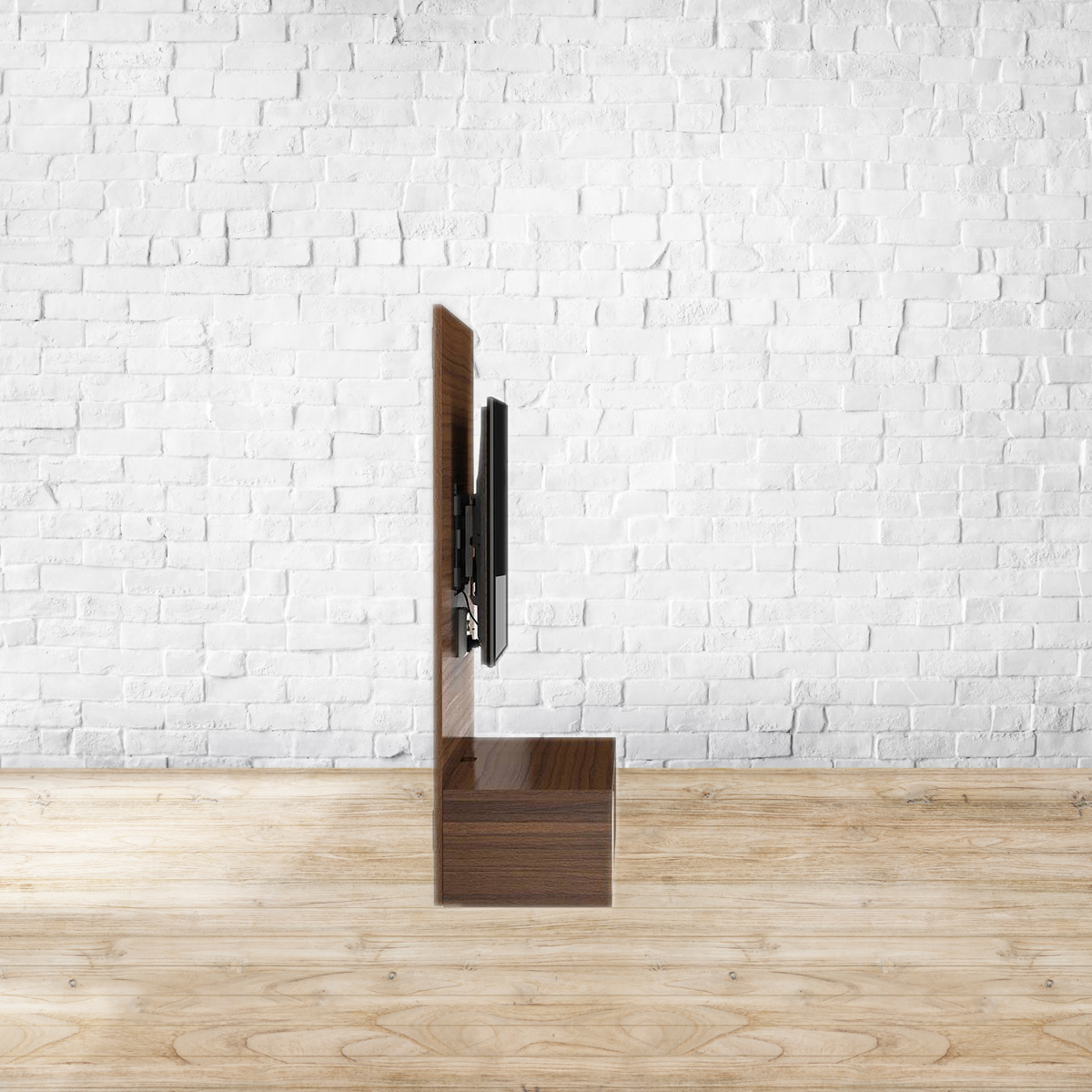 Twisted in the head. Bid goodbye to strained eyes, annoying glares and awkward viewing angles. The Iwaki’s swivel feature allows the TV to be pulled out, pushed in or twisted as required. A wire management system keeps unsightly wires concealed. A mix of open and closed storage makes room for media paraphernalia. You’re welcome, couch potatoes. You’re welcome. Made from particle wood. Please refer to images for dimension details. Indoor use only. Note : We will not be able to mount the TV to the wall-mounted TV unit or handle rewiring. Please arrange for a handyman/electrician to get these done.