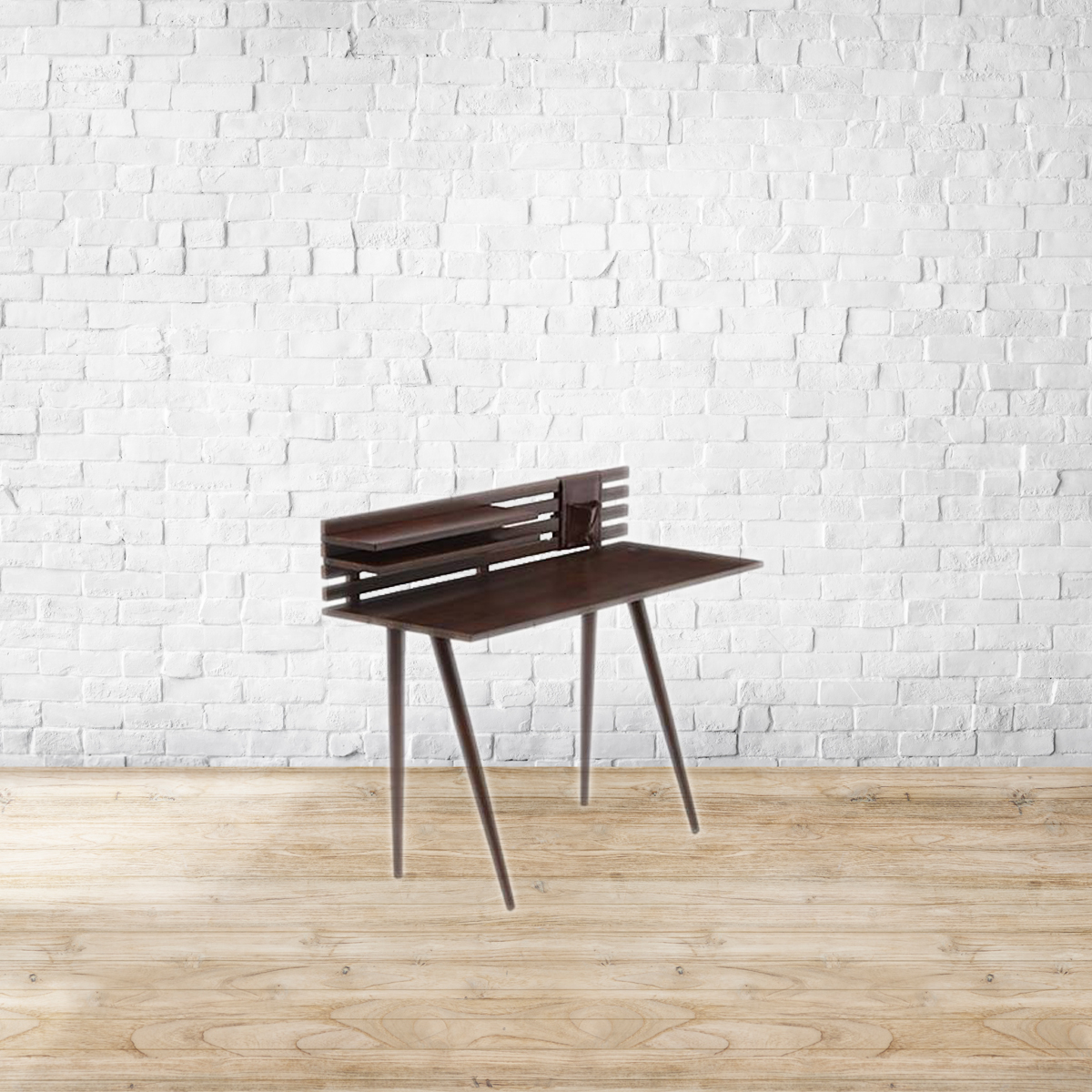 On pointe. Perfectly balanced, the Fonteyn study table has a distinctive leg detail, unique to the range. The spacious table has wooden panel slats so you can configure and move the shelves to where you need it. Designed to help you make the most of the work surface, the table comes with a cup holder, so your mug of coffee (or tea) fits snuggly in the groove, reducing the chance of spills across documents or your laptop. The leatherette pouch is detachable as well, so you can move it or remove it, as you please. Made from natural rubber wood, the table comes with a Natural Signature stamp, certifying the product’s zero wastage property. The natural wood knots inherent to the wood are preserved, highlighting the organic look, and the knots are unique to every table, no two pieces are alike. Made from solid Rubberwood.Movable components include detachable leather pouch and two shelves. We recommend placing the table flush against the wall, lengthwise, to eliminate any sideways movement or wobbling. Please refer to the images for dimension details.