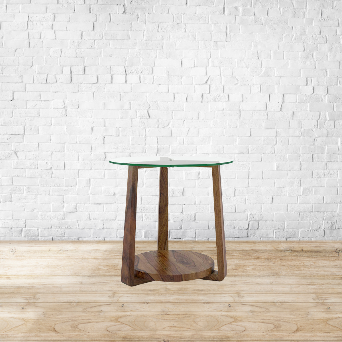 A three-legged affair. The Jones lends your living room the perfect charm to spark coffee table conversations. Built with strong Sheesham, a panel below snugly holds your books and belongings. A glass disc fastened above makes a show of your other knick knacks. Made from sheesham wood.Glass tabletop. Please refer to images for dimension details. Indoor use only